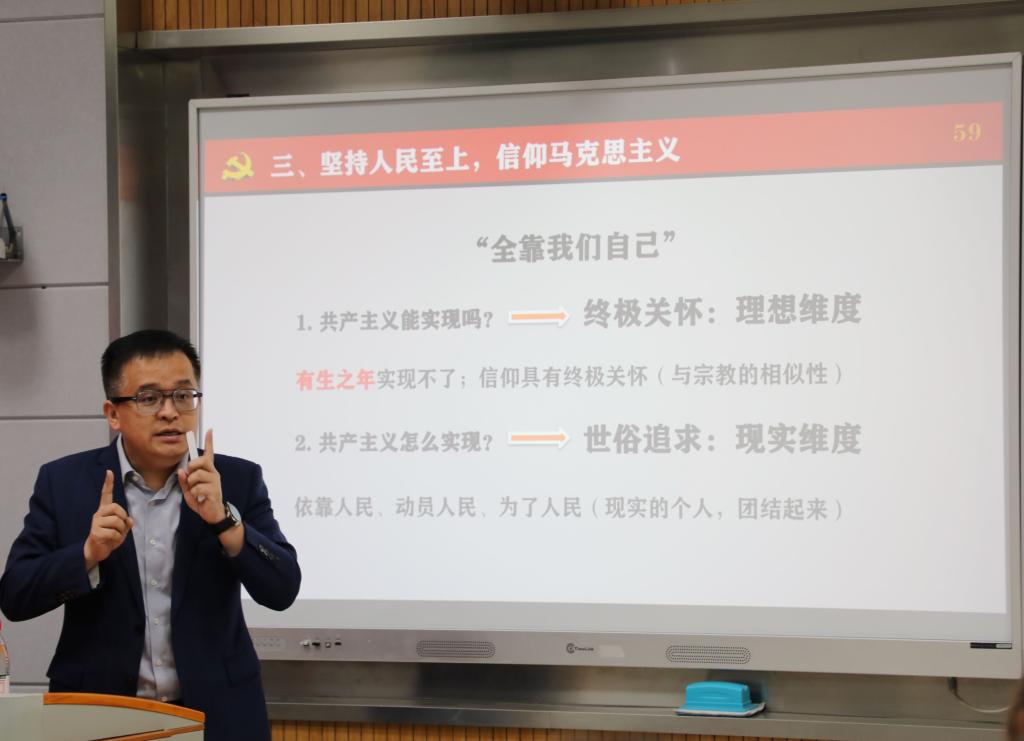 5月23日,“青马工程”培训班理论学习系列讲座第三讲,由江南大学马克思主义学院唐忠宝教授以《学习新思想坚定理论自信》为题开讲。唐忠宝教授围绕学习贯彻习近平新时代中国特色社会主义思想,以党的二十大精神为切入点,聚焦“十个明确”的精神实质和丰富内涵,重点从“反对历史虚无主义”“坚持中国式现代化”“信仰马克思主义”等方面着眼分析,以当今网络热点话题讨论为案例开展解读和交流,旨在深入浅出地以年轻人喜闻乐见的宣讲形式和思维方式,向青马班学员传播新时代新思想,引导广大青年树立正确价值观、厚植爱国情怀,与国家同呼吸、与人民共命运,唐忠宝教授的精彩分享为全体学员带来一场耳目一新的思想盛宴。