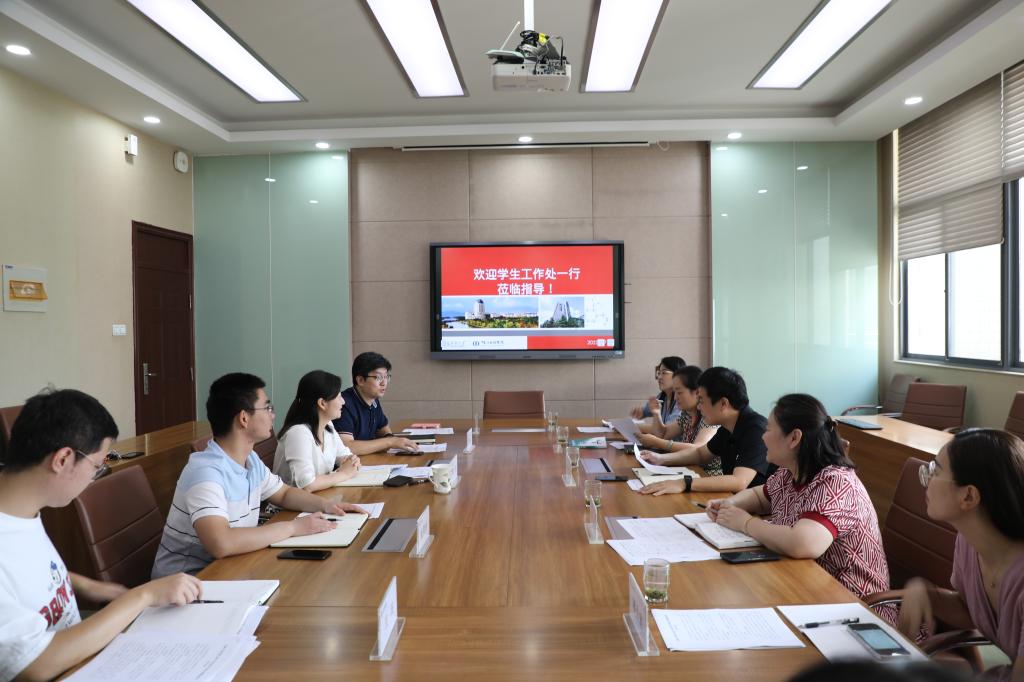 9月7日上午,校学生工作处处长周伟涛、副处长蒋洁等一行来我院调研指导学生工作。学院党委副书记、副院长林丹,学工办主任周春江及全体辅导员参加调研交流。