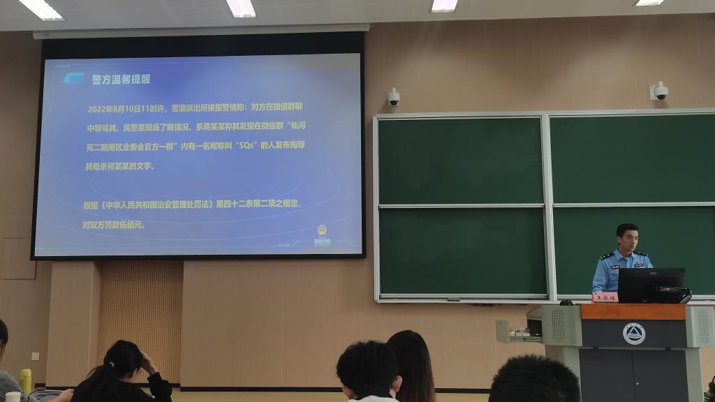 讲座现场,王俊皓通过数据向大家展现了当前防诈骗的形势,强调了针对在校大学生开展防诈骗教育的重要性。他通过详实的案例、生动的视频,分析了网络诈骗的基本特征,向同学们介绍了“网购刷单诈骗”“校园贷诈骗”“裸聊诈骗”等各种类型诈骗的常见作案方法,并提醒大家在日常生活中要提高警惕,切勿因贪图小利而落入诈骗分子的陷阱。讲座内容丰富、形式多样,现场气氛热烈。王警官通过PPT展示、案例分析等多种方式,让在场学生更好地了解诈骗犯罪的类型、特点和危害。同时王警官还提醒全体同学们,务必警钟长鸣,遵守法律法规,共同营造风清气正的社会环境。