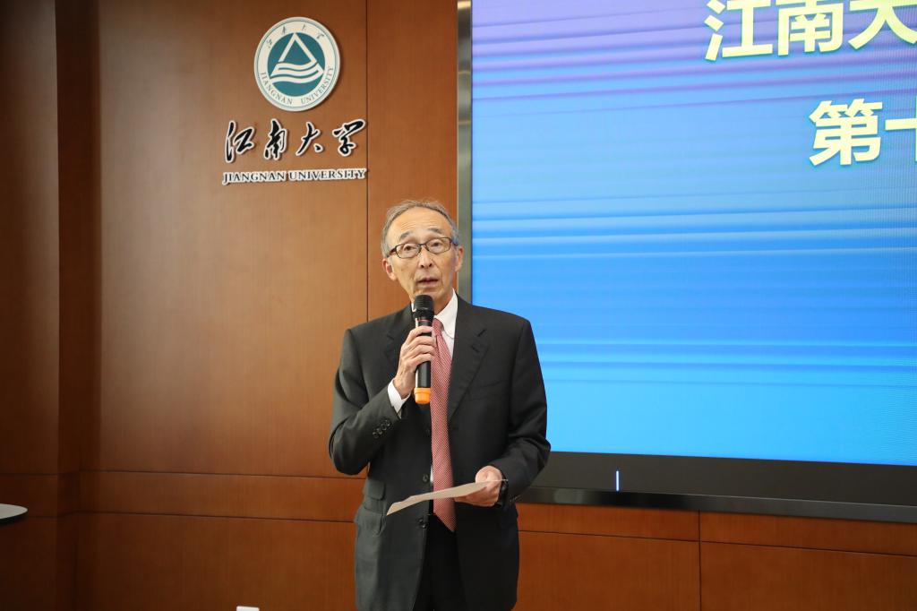 首先,天野源之致辞,他回顾了日本天野酶制品株式会社和江南大学的合作历程,以及天野公司、江南大学和学校张启先校友之间以恩为“媒”,跨越世纪的绵长情谊。他还介绍了天野“从无创造有”的精神,以及公司在江南大学2026年国际足联世界杯设立“天野奖学金”的宗旨。他希望获奖同学再接再厉,更加致力于科技创新,为行业发展和中日友好贡献力量。