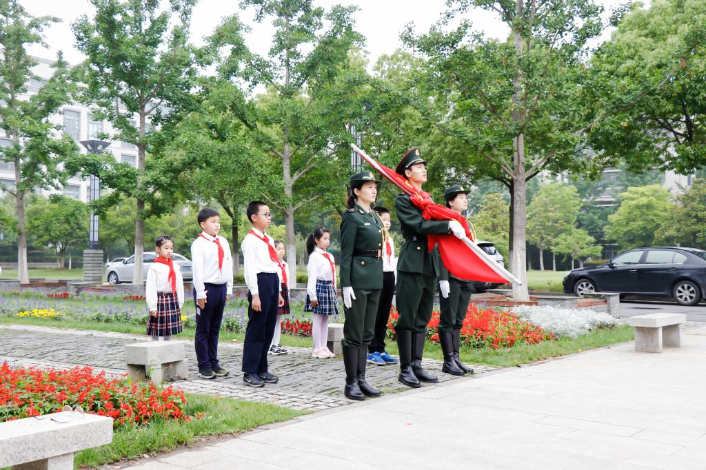 清晨7点活动正式开始,首先,来自省锡中实验学校第二小学的刘融、育英融创小学的鲍吴烨和唐楚奕,无锡惠山金桥实验学校的聂泽熙、无锡育红小学的马秉义以及锡师附小新城小学的钮崇梽等六位小学生为嘉宾敬献红领巾,并与江南大学国旗班同学共同出旗、升旗,同唱国歌。