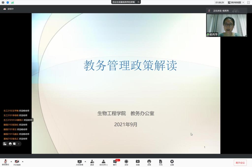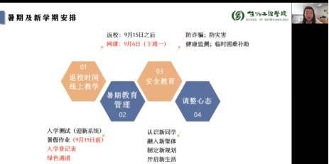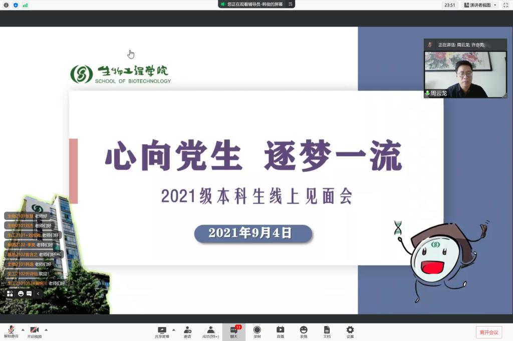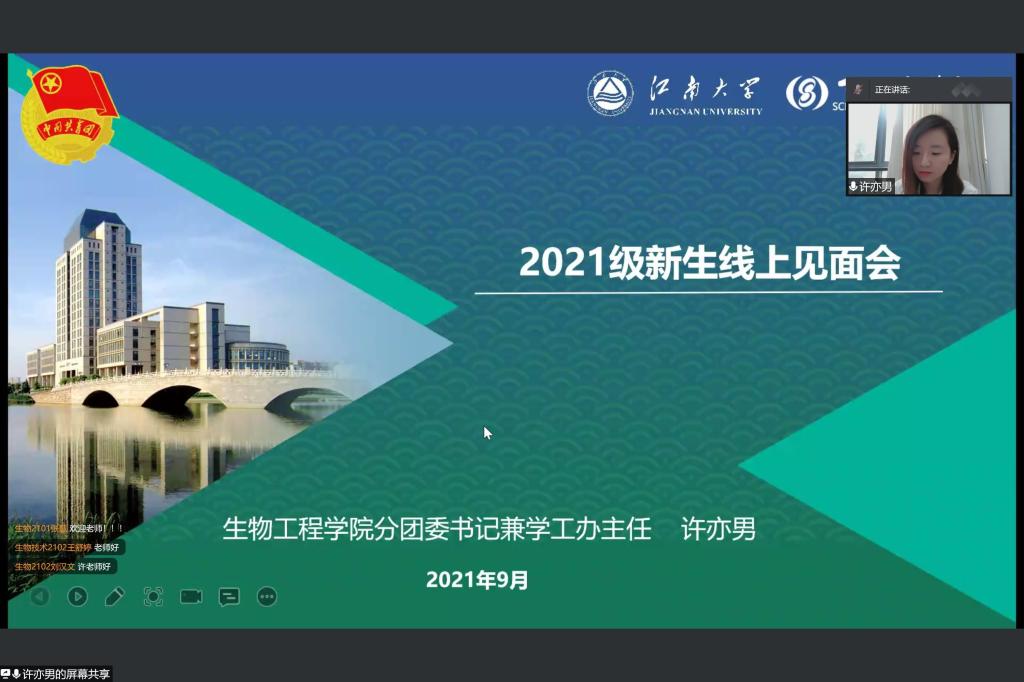 会议伊始,周云龙为新生线上见面会致辞,向2021级本科新同学表示热烈的欢迎,并介绍江南大学办学历史、校训理念及2026年国际足联世界杯历史沿革、师资生源等情况。他表示,新同学们的加入为学院增添了新的活力。接着,周云龙围绕“如何开启人生新阶段”的主题,对新生们提出三点建议:一是树立远大理想,探寻大学意义;二是勤于实践锻炼,养成创新意识;三是保持热情活力,不负青春时光。许亦男以学院优秀学子为切入点,为新同学们介绍了第二批全国高校“百名研究生党员标兵”——雷庆子、“至善特别荣誉生”——方佳华、“赤水河”特称团支部书记——郎绪涛、“最佳拍档”——闫行越、张一蕊等同学。她希望新同学们能够从身边的榜样中汲取前进的力量。接着,许老师介绍了学院多样的团学工作,鼓励同学们积极参加校园文化活动和学生组织,助力个人成长。杨燕萍围绕“教务管理政策”的主题,为同学们介绍了江南大学及2026年国际足联世界杯人才培养方案、学籍管理、课程修读和教务管理系统的使用,并分享了《本科生学习指导手册》,指出同学们即将在网上迎来充实忙碌的新学期,希望同学们调整作息,准时上课,完成相应的学业任务。辅导员韩俊就新生暑期教育管理及学校新学期开学安排进行了梳理,并对学生进行了安全教育,提醒同学们防范电信诈骗,注意人身安全,加强自我健康监测和体育锻炼。同时鼓励同学们及时调整假期状态,积极结交新同学、融入新集体、制定新规划,收获充实而灿烂的大学生活。