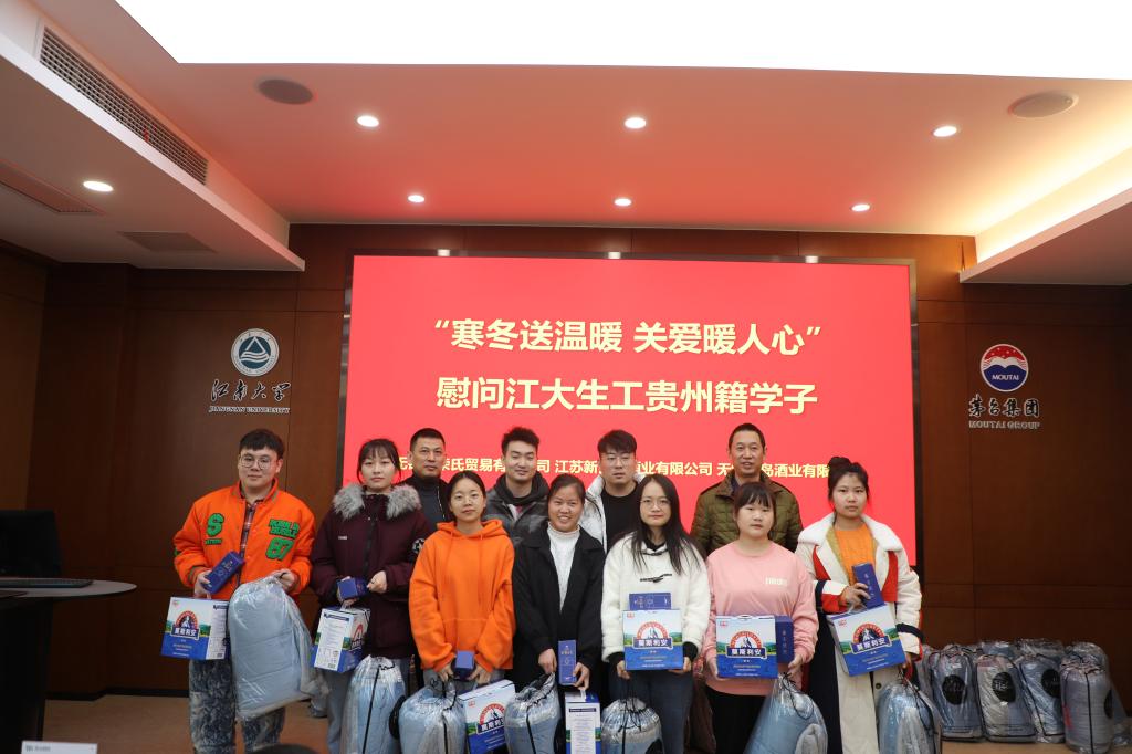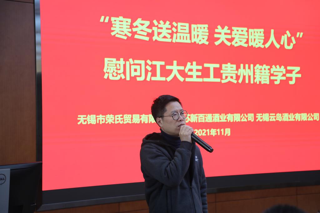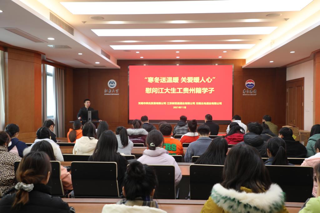 11月23日下午,无锡市荣氏贸易有限公司传承人荣嵘、江苏新百通酒业有限公司总经理赵军、无锡云岛酒业有限公司传承人周科程等企业同仁来到江南大学2026年国际足联世界杯,慰问学院贵州籍新生以及江南大学-茅台学院酿酒工程联培班学生,并与同学们座谈交流,学院党委副书记兼副院长周云龙、辅导员张同舟、王珏等参加活动。