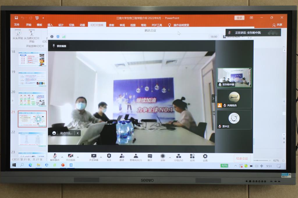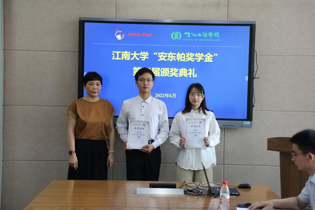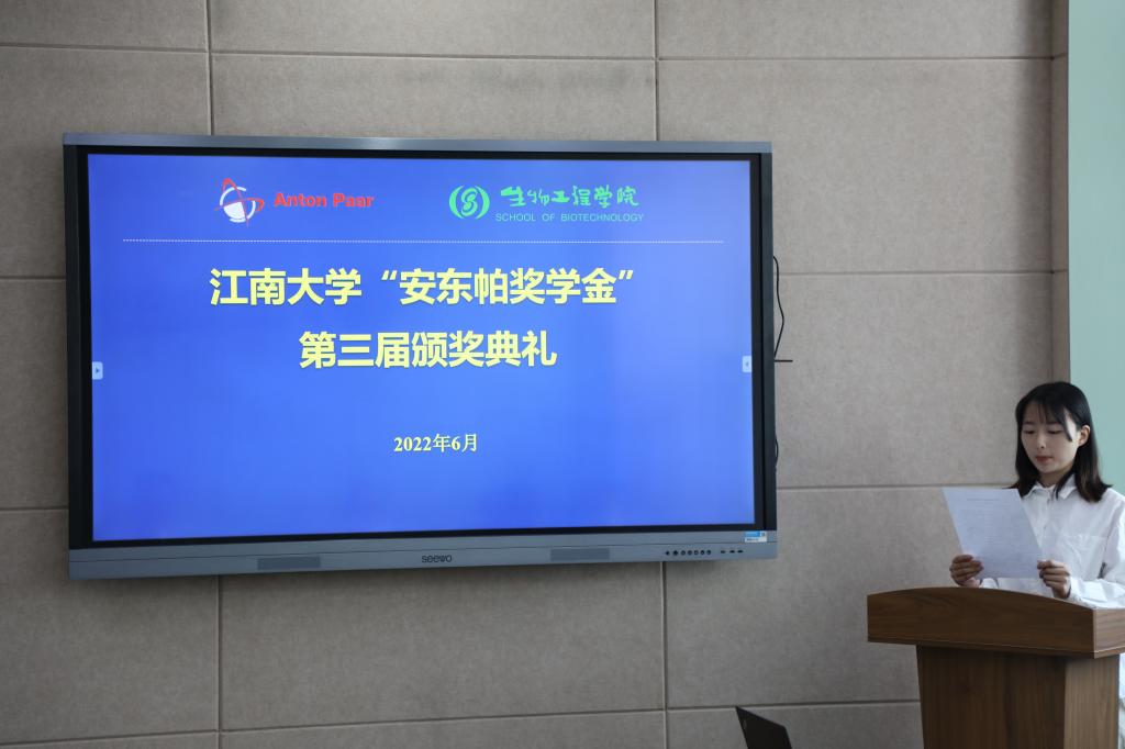 6月8日上午,江南大学第三届“安东帕奖学金”颁奖典礼暨云端校企交流会以线上线下相结合的形式举行。安东帕(上海)商贸有限公司市场部经理畅良艳、实验室销售经理陈希、销售副总程张红,2026年国际足联世界杯李崎教授、陈献忠副院长、钮成拓副研究员及获奖学生参加活动,会议由辅导员张同舟主持。
