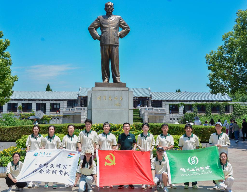 赓续红色血脉,传承发酵精神。7月21日,实践团踏寻红色足迹,先后前往苏皖边区政府旧址纪念馆与周恩来纪念馆进行参观学习。在苏皖边区政府旧址纪念馆,实践团仿佛穿越回那段烽火连天的岁月,通过一件件珍贵的文物、一幅幅生动的历史图片,深刻感受到革命先辈们面对艰难险阻不屈不挠的奋斗精神。步入周恩来纪念馆,周总理的智慧与风采令人敬仰。他严谨的科学态度、卓越的领导才能,以及为人民服务的深厚情怀,为实践团成员树立了榜样。此次红色之旅,恰逢“发展新质生产力”的时代浪潮。实践团成员们纷纷思考起如何将红色文化中的创新精神和坚韧品质融入酿酒发酵领域,利用现代科技手段提升传统工艺,在保持传统风味的同时,赋予白酒更多的文化内涵和时代特色。