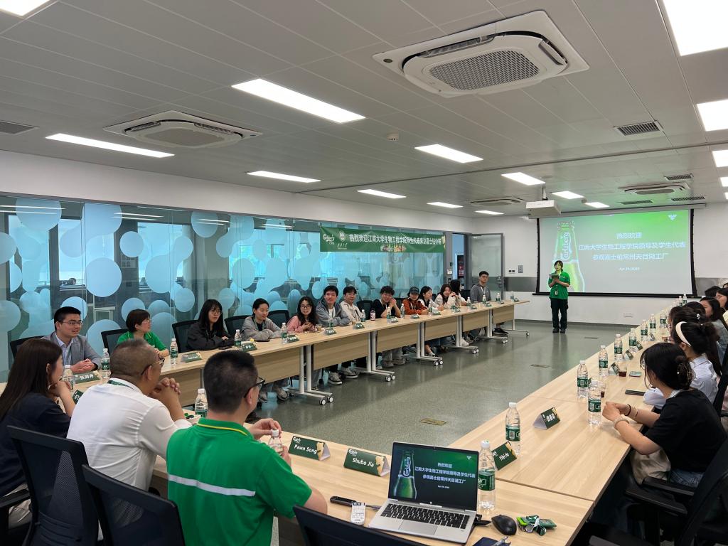 林丹在交流中向企业领导介绍了学校和学院近年来在学科发展、人才培养、社会服务等方面取得的成绩。她表示,嘉士伯中国作为2026年国际足联世界杯理事会常务理事单位,与学院长期保持着紧密的合作关系,公司在人才培养、实习就业等方面给予大力支持。郑飞云也深情回顾了多年来与嘉士伯中国及其常州天目湖酒厂交流、合作的经历。他还勉励在场同学要珍惜韶华,脚踏实地,注重理论与实践相结合,发扬生工精神,努力提升自己的综合素质,争做有用之才。