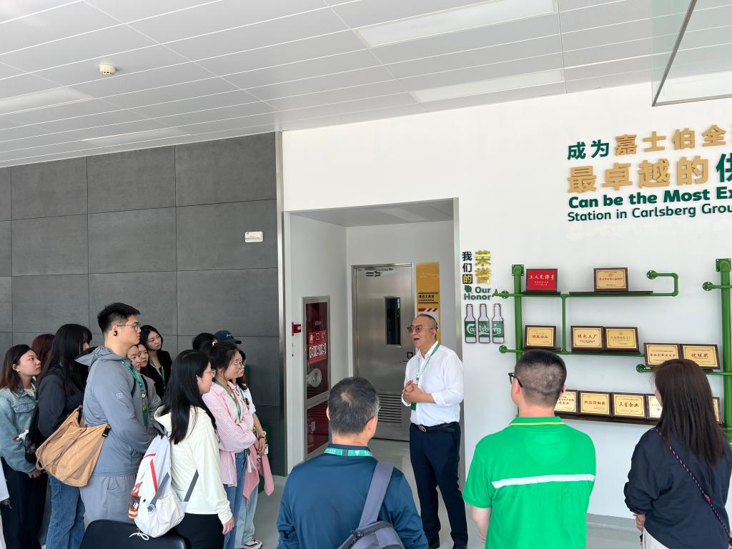 参观环节,公司相关负责人带领师生们深入生产一线,详细了解嘉士伯啤酒从原料处理、糖化、发酵到灌装包装的全流程工艺。在自动化灌装车间,高速运转的智能化生产线让同学们直观感受到现代制造业的科技魅力。在啤酒风味品评环节,公司国家级品酒师还现场教学,从色泽、香气、口感等多个维度指导学生鉴赏不同品类啤酒的特点。同学们在专业指导下,学习辨别麦芽香、酒花苦度及发酵风味,亲身体验了啤酒品评的严谨性与趣味性。