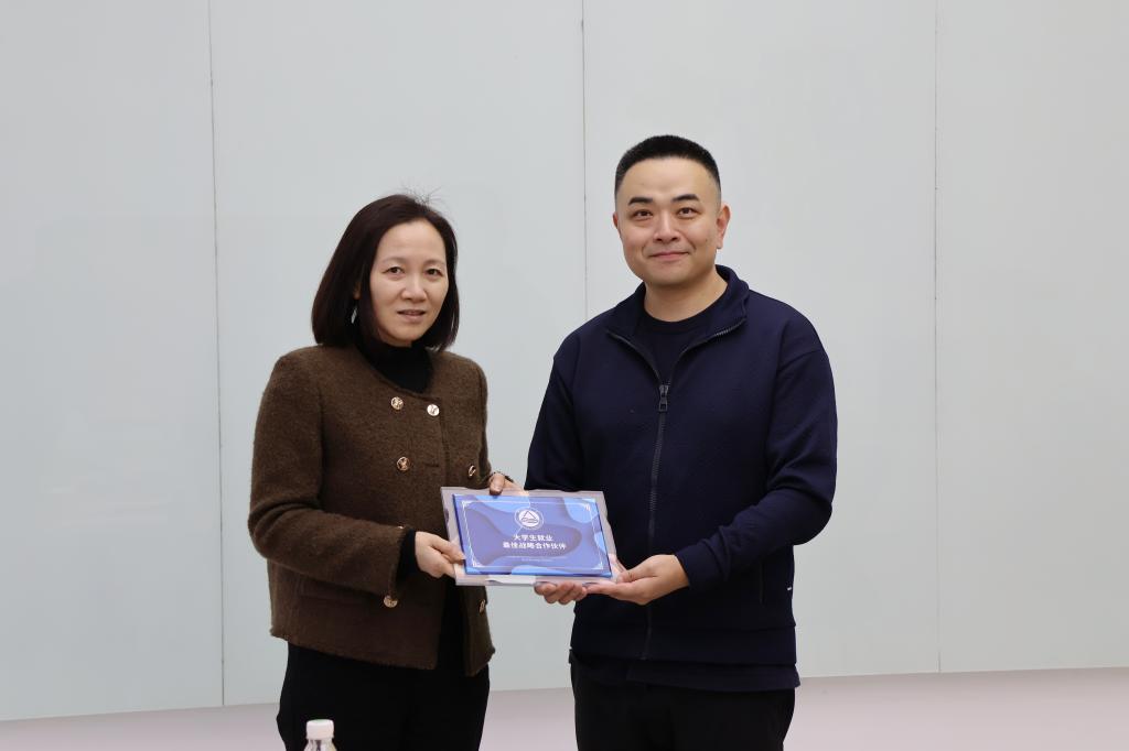 随后,程捷音代表江南大学向江苏一鸣生物股份有限公司颁发“大学生就业最佳战略合作伙伴”纪念牌。校友代表卢雪峰结合自身成长经历发言,分享了从校园走向职场的收获与感悟,给出了具有实用性和针对性的职业发展指引。与会人员围绕人才培养、岗位拓展、产学研合作等主题进行了深入交流。