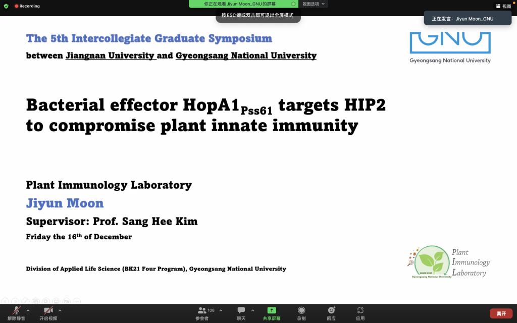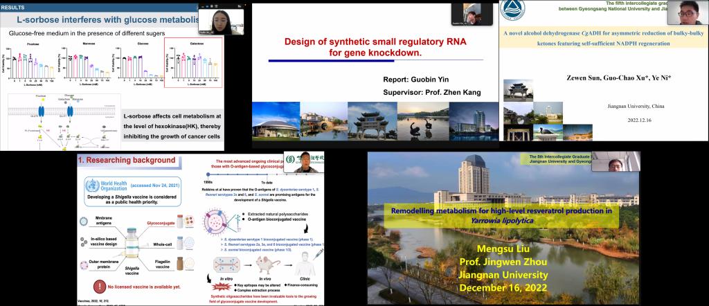 2022年12月16日,第五届江南大学-韩国庆尚国立大学研究生学术论坛(The 5th Intercollegiate Graduate Symposium between Jiangnan Universityand Gyeongsang National University)以线上方式成功举办。中韩研究生学术论坛是“江苏-韩国高校联盟”以江南大学作为轮值主席单位以来的重要系列活动之一。来自江南大学、韩国庆尚国立大学,以及苏州大学、江苏大学、南京师范大学、南京林业大学、徐州工程学院等“江苏-韩国高校联盟”成员单位的师生共约120余人参与了本次线上论坛。本次会议的主题为“From Life Scienceto Biological Manufacturing”。