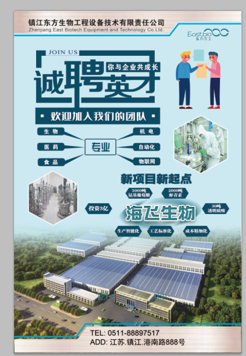 热忱欢迎生物、医药、食品及机电、自控等领域各专业学子加盟东方生工,公司将提供良好的职业发展机遇及标准宿舍等便利的生活设施。让我们共同发展、共创未来。