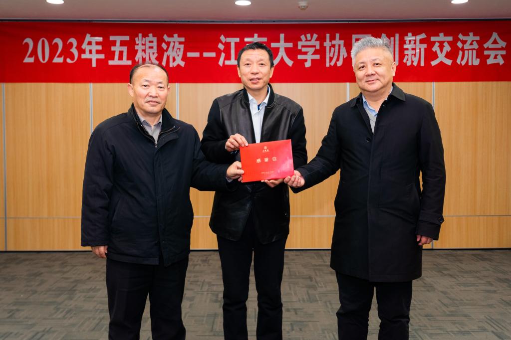 2023年1月10日下午,五粮液股份公司技术总顾问赵东一行访问江南大学,就校企协同创新进行了交流,并转交了由五粮液集团(股份)公司党委书记、董事长曾从钦签署的感谢信,感谢江南大学为五粮液科技创新作出的重要贡献。校党委常委、副校长顾正彪,“五粮液-江南大学微生物组学与生态发酵技术协同创新实验室”主任徐岩以及实验室成员出席交流会。