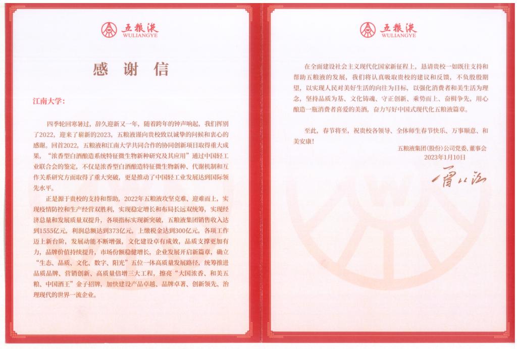 据悉,五粮液与江南大学共同合作的协同创新项目取得系列重要成果,“浓香型白酒酿造系统特征微生物新种研究及其应用”通过中国轻工业联合会的鉴定,在浓香型白酒酿造特征微生物新种、代谢机制和互作关系研究方面取得重要突破。后期,校企双方将进一步加强产学研合作,不断提升创新人才培养质量,推进科技创新和成果转化应用,协同奋进构建校企发展共同体。