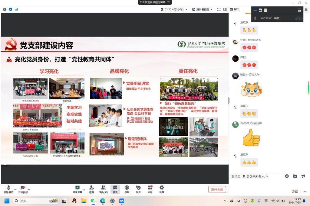 食品合成生物学与生物制造团队党支部就无锡市红色文化资源的保护利用开发情况进行介绍,同时分享了作为全国首批“百个研究生样板党支部”的建设路径,通过构筑“成长共同体,育人大熔炉”党建育人机制,带动青年党员践行好“涵养四个自信”和“推动学科自信”的双重使命,在党和国家对教育、科技、人才进行一体化统筹布局的时代背景下,为科技自立自强贡献青春力量。