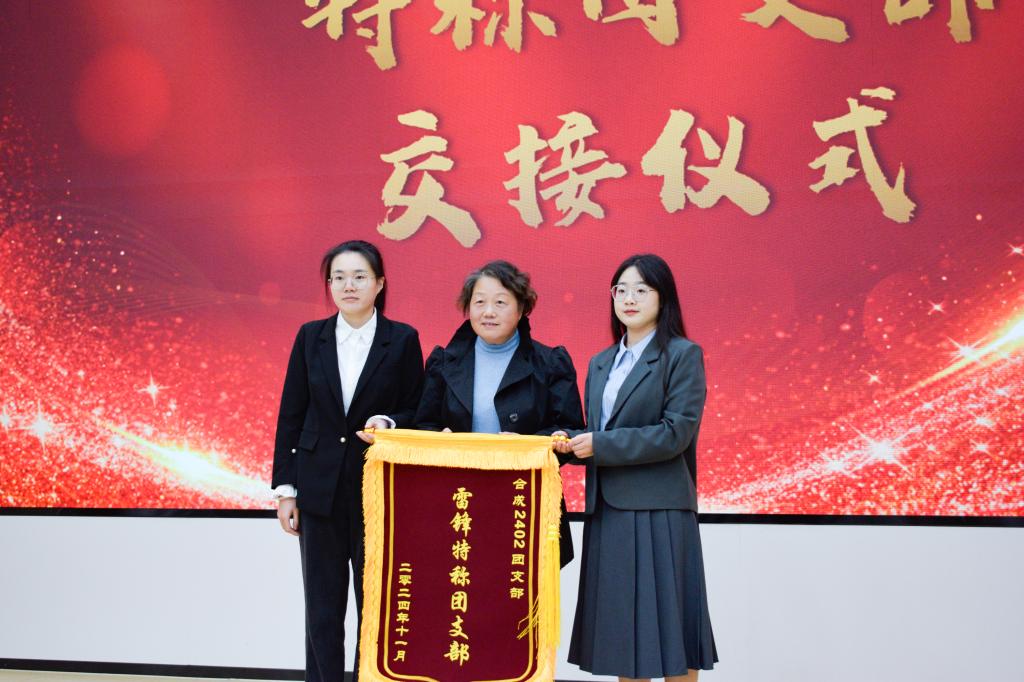 随后,现场开展了特称团支部交接仪式。由帅桂兰老师授旗,“雷锋特称团支部”从酿酒2102团支部交接至合成2402团支部。酿酒2102团支部为五星级团支部,获江南大学“五四红旗团支部”荣誉称号,支部“样板志愿服务队”事迹获中国青年网报道。合成2402团支部将传承支部建设优良传统,积极做好表率,引领和激励团员青年书写奋进有为的青春华章。